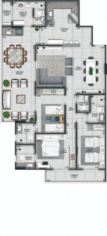 Apartamento 03 suítes, sala com sacada gourmet, cozinha, área de serviço e 02 vagas de garagem.