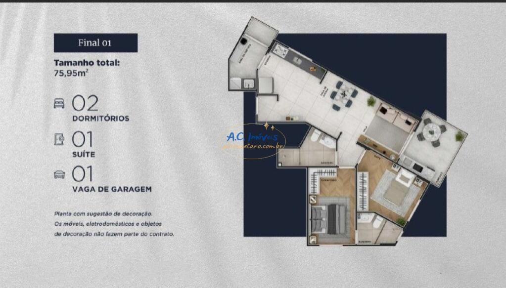 Unidade com 02 dormitórios sendo 01 suíte, área de serviço, sala dois ambientes, terraço gourmet, 01 vaga de garagem.