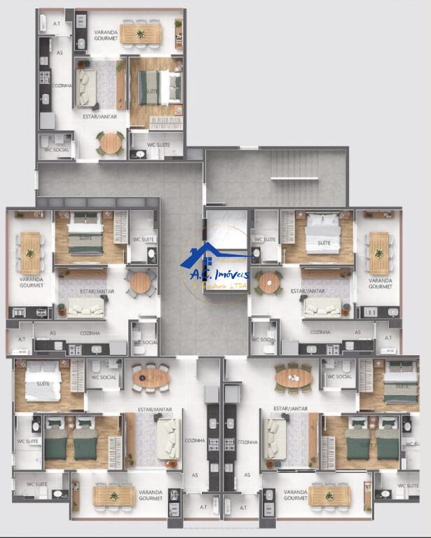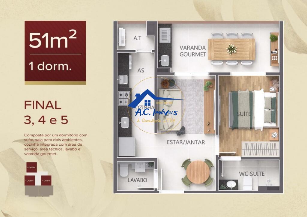 O apartamento possui 01 dormitório, sendo 01 suíte, sala com sacada gourmet, cozinha, banheiro e 01 vaga de garagem.