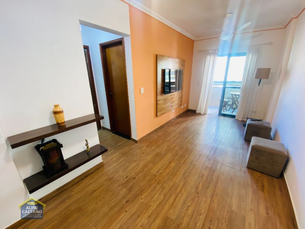 Apartamento mobiliado de 2 dormitórios, localizado em prédio frente ao mar, sala, cozinha americana, 2 WC sociais, área de serviço e 1 vaga de garagem coletiva.