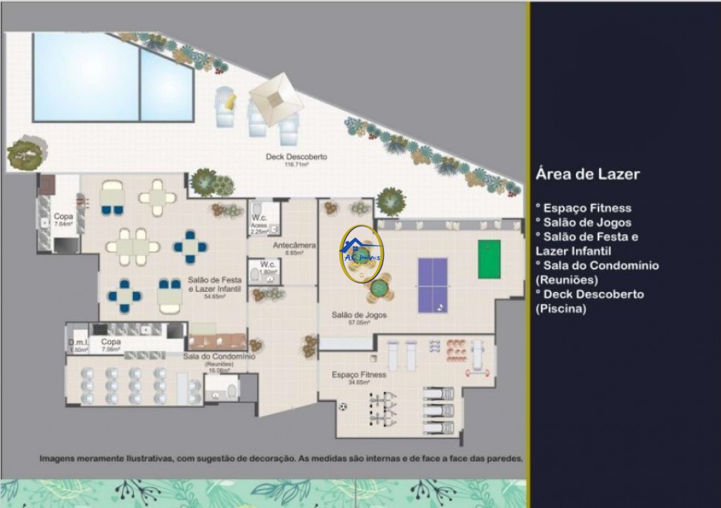 - Fitness, salão de festas, jogos e piscina com Deck