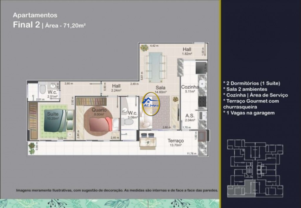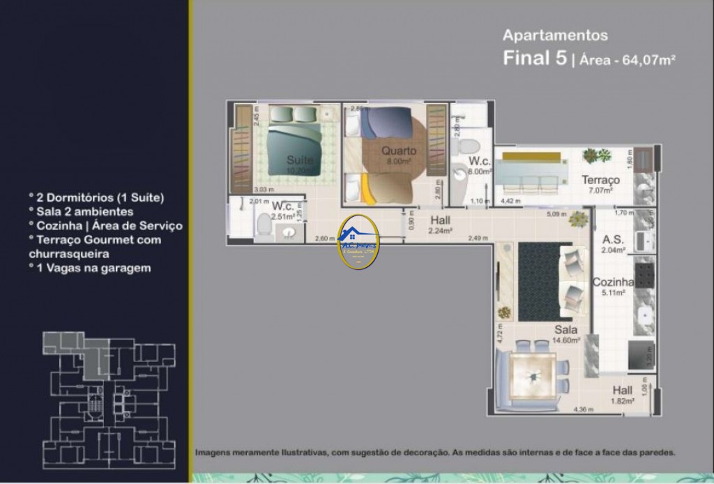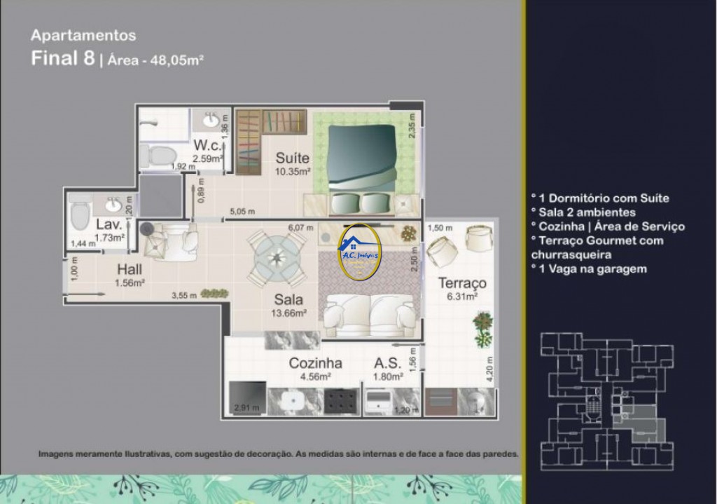 Possui 1 dormitório suíte, sala dois ambientes, terraço gourmet com churrasqueira, cozinha, área de serviço e 1 vaga de garagem