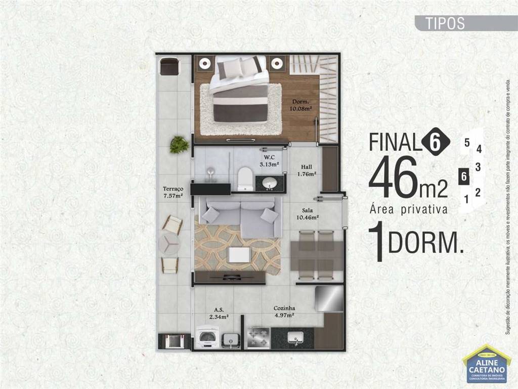 Com 1 dormitório, sala com sacada com churrasqueira, 1 vaga de garagem.
