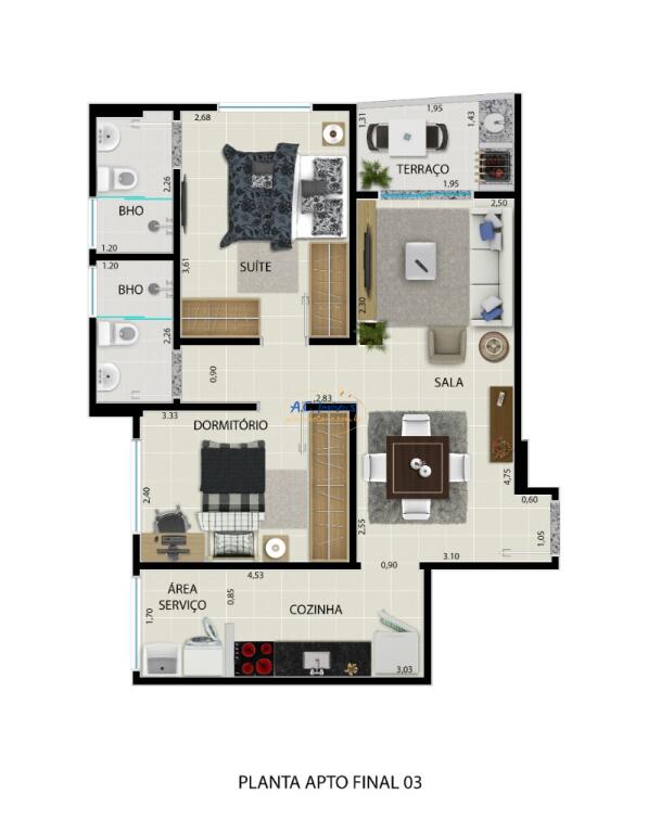 São 02 dormitórios, sendo 01 suíte, sala com sacada gourmet, cozinha, banheiro e 01 vaga de garagem.