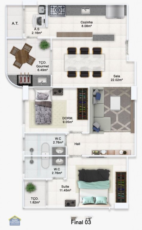 Com 2 dormitórios sendo 1 suíte, sala com varanda gourmet, área técnica para ar condicionado, 1 vaga de garagem.