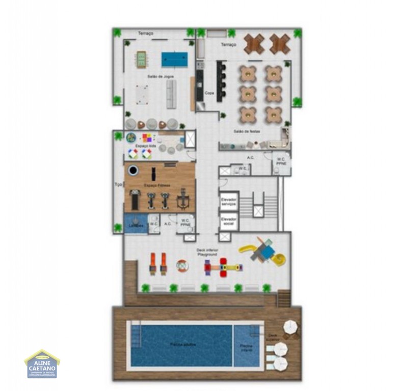 - Spa, Salão de festas, Lounge, espaço gourmet, Playground, Academia, Sauna, Bar, Piscina.