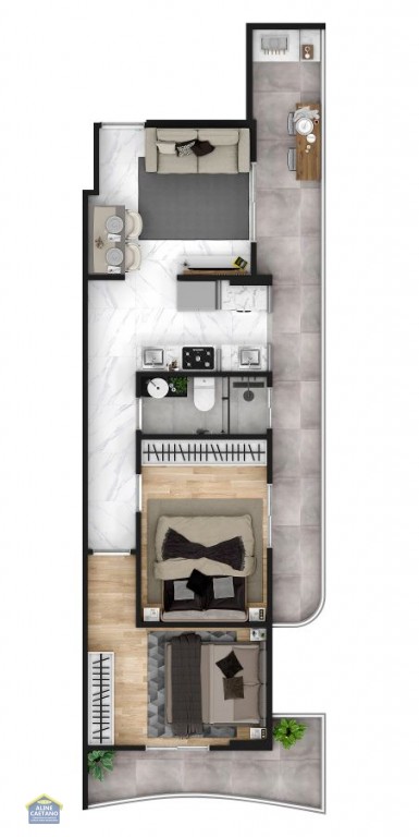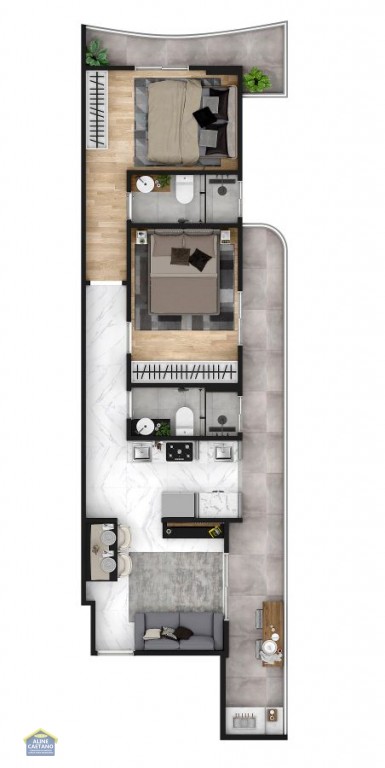 Apartamento 02 dormitórios, sendo 01 suíte, sala com sacada, cozinha, área de serviço e 01 vaga de garagem.
